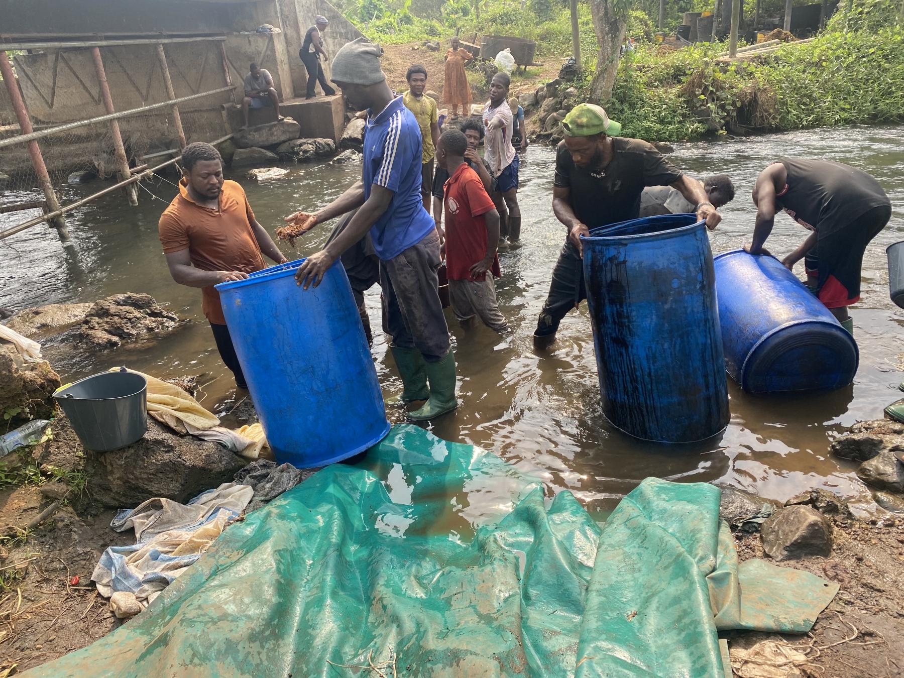 Après la cueillette, les grappes sont mises en décomposition et lavées. Une séance de lavage. Photo: Josiane Kouagheu/ Agripreneurs d’Afrique