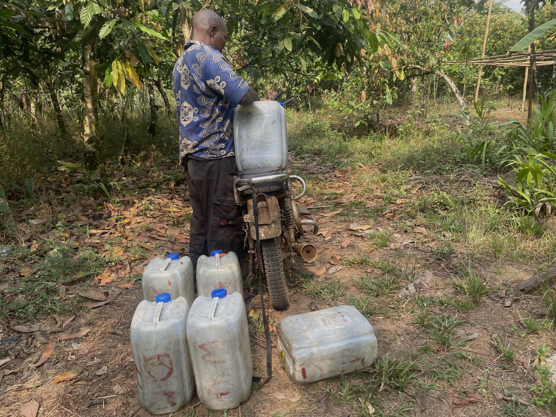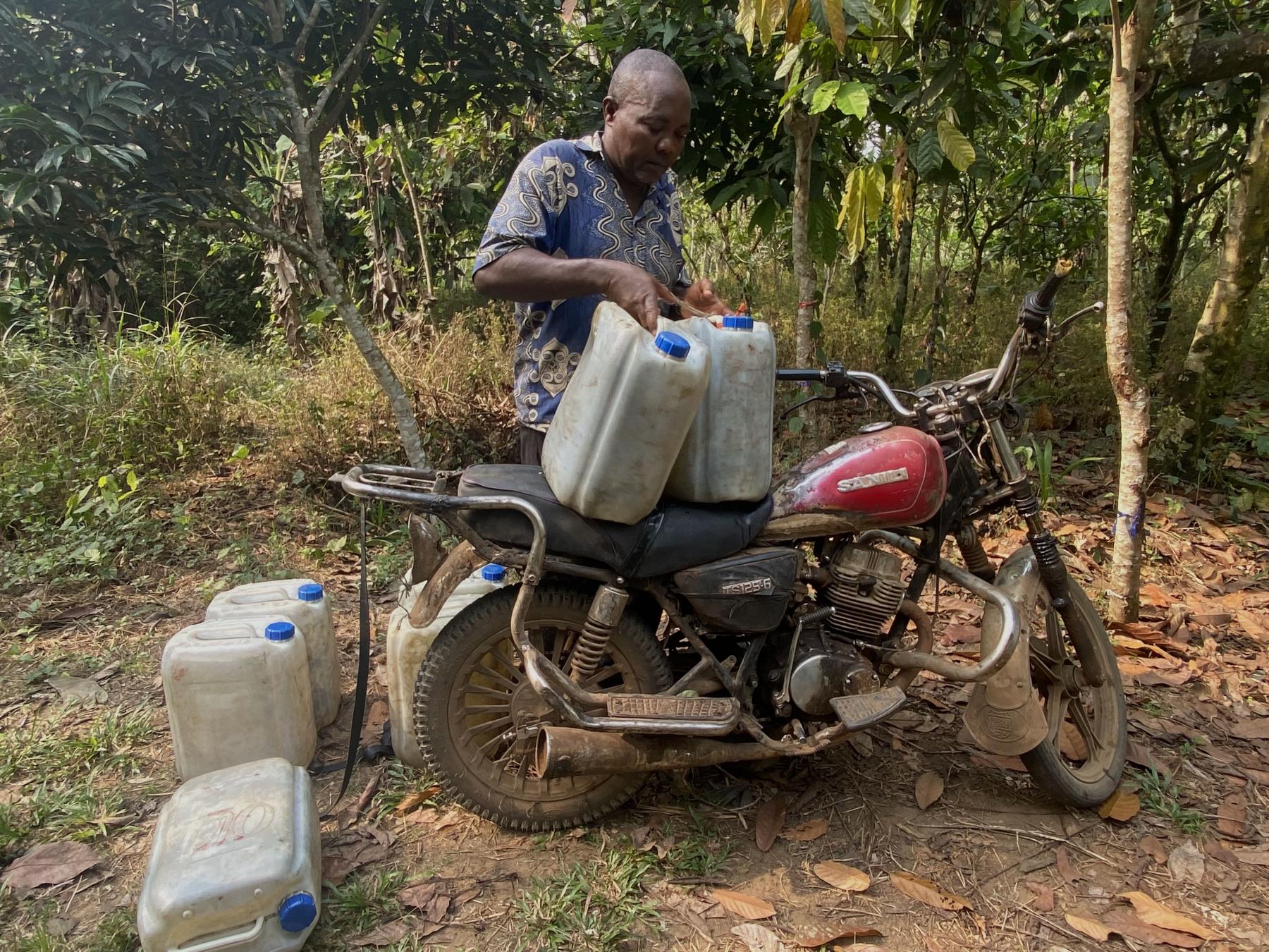 Guy Merlin Tchamtchou attache sept bidons vides de 20 litres sur sa moto. Photo: Josiane Kouagheu / Agripreneurs d’Afrique