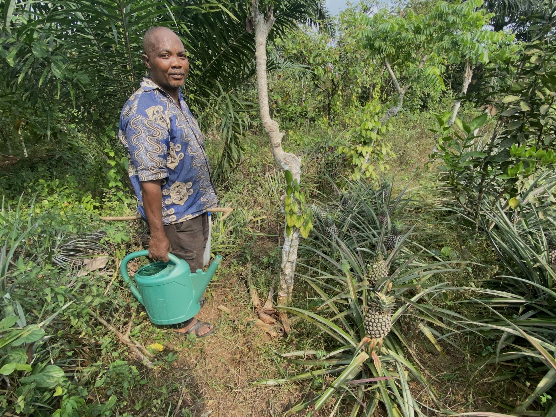 Guy Merlin Tchamtchou a pris la résolution d’arroser son champ en décembre 2025, après des années à perdre des plantes, grillées par le soleil. Photo: Josiane Kouagheu / Agripreneurs d’Afrique