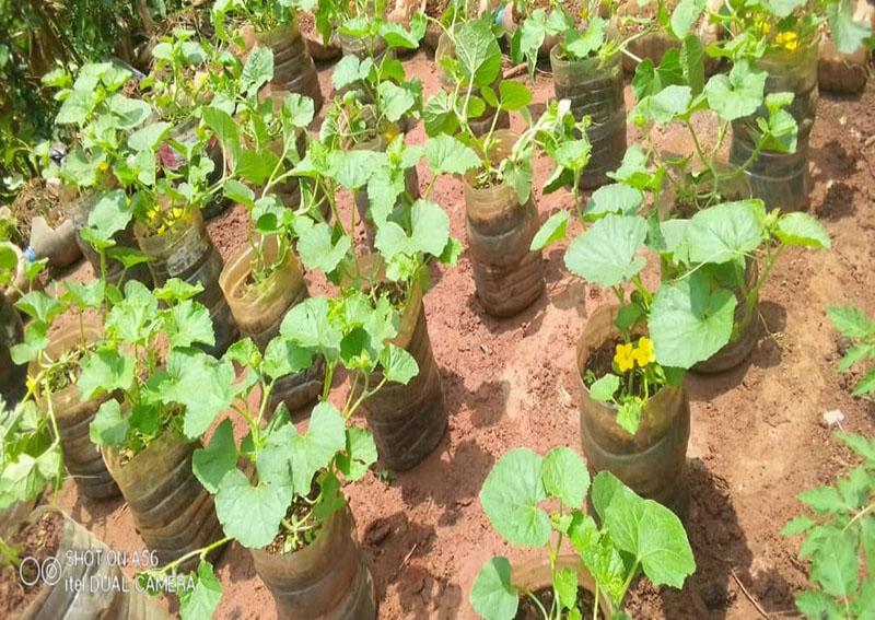Alors, sur un espace réduit de 100 mètres carrés, sont disposés des bouteilles plastiques à l’intérieur desquelles poussent baselic, laitues, persils, poireau, tomates. Il faut compter environ deux mois pour la récolte. Pour y parvenir, le jeune récupère dans son environnement des bouteilles. «Tout le nécessaire vient de l environnement, que ce soit les bouteilles plastiques ou mes composts» , révèle -t-il. Pour avoir un meilleur résultat, il donne des formes circulaires et ovales à ses bouteilles. Par la suite, il dispose dans chaque bouteille, de la terre et du compost qu’il a lui-même confectionné.